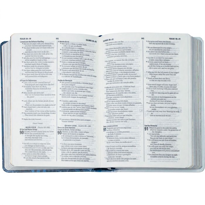Esta é uma edição bilíngue da Bíblia Sagrada, apresentando lado a lado as traduções Good News Translation (GNT) em inglês e a Nova Tradução na Linguagem de Hoje (NTLH) em português.